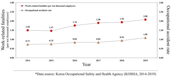 In South Korea (henceforth, Korea), a “Five-year Occupational Accident Prevention Plan” is being implemented [], which proposes to achieve accident prevention targets within a certain period of time. In Japan, the “Occupational Accident Prevention Plan” has been established with the aim of encouraging safety and health-related activities targeted at workers. In Germany, along with the technology policy strategy “Industrie 4.0”, “Arbeiten 4.0” is also being promoted to improve quality of work. In the UK, the Occupational Safety and Health Executive has created and implemented an annual “HSE Business Plan” to ensure the safety and health of employees [].