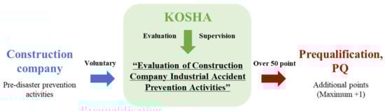 In Korea, the Korea Occupational Safety and Health Corporation implemented the “Evaluation of Construction Company Industrial Accident Prevention Activities” system in 2014. This system encourages voluntary accident prevention activities by construction companies and is characterized by a lack of legal compulsion and policy support. Thus, to induce voluntary participation, the system gives a maximum of +1 point for pre-qualification (PQ) and allows construction companies to receive additional points for order-taking activities for public work projects when the evaluation score is 50 points or more. Thus, a system of pre-autonomous safety and health-related activities for construction companies has been established under the guidance of state agencies.