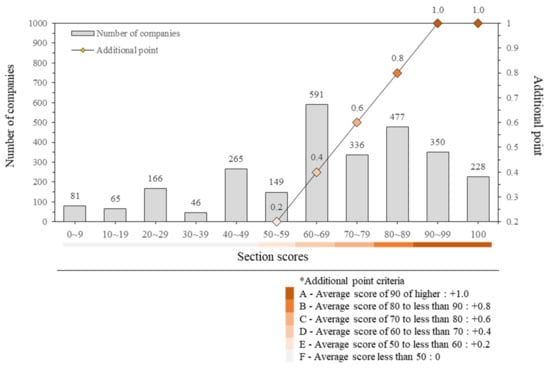 To determine the rate at which companies participating in this system receive additional points for PQ, evaluation points are sorted by section and shown in a graph in Figure 4. Of the 2754 companies participating in the evaluation, 2131 (77%) received additional points in PQ (50 points or more). Among the companies with an evaluation point of 50 or higher, 10.7% received the highest possible score of +1, and 7% received the lowest score of +0.2. The remaining 92.3% scored between +0.4 and +0.8.