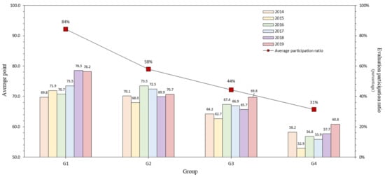 Participation ratio and average point trend by group, classified according to year.