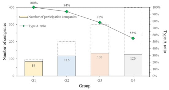 In Figure 5, the participation ratio and average points earned by the group are listed and plotted as a graph over six years. The graph confirms that the participation ratio and average points of the top construction companies were high. Figure 6 shows the ratio of Type A companies participating in the evaluation. Likewise, companies in the upper group showed proportional results.