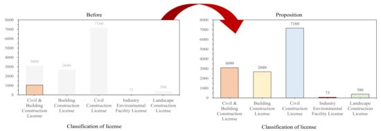 - In the case of improvement of the classification system, the experience of participating in the evaluation and the safety and health competency of companies with participation qualifications were considered. This led to the proposed classification into EG1, EG2, and EG3 as the ranking of the total construction capability evaluation (total construction capacity evaluation number of licenses held by general construction companies);