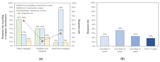 Opinions on the proposed improvement model study were analyzed using survey responses distributed through five organizations for all general construction companies. Regarding the size of the companies belonging to the survey respondents, 59% of the total respondents were large companies, 11% mid-sized companies, and 30% small and medium-sized companies, and the status of license holdings for affiliated companies is shown in Figure 8a. Figure 8b shows the industry experience of the survey.