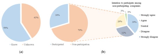 In Figure 9a, we can see that 59% answered “know” in the survey to the question regarding whether they knew the system. In addition, the survey question regarding whether they participated in the system, the percentage of nonparticipation was found to be 70%. Among nonparticipating companies, 97% of all respondents with “neutral” or higher expressed willingness to participate in the future, as shown in Figure 9b.