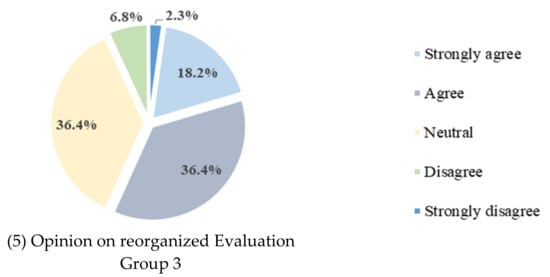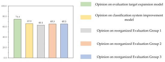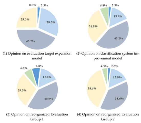 Figure 10 shows the questionnaire survey on the model for expanding the evaluation targets and improving the classification system proposed in this study. (1) In the expanded opinion of the evaluation target, more than 72.7% answered “agree”, 25% answered “neutral”, and 2.3% answered “disagree”. (2) Regarding opinions about whether the classification system required improvement, 59.1% answered “agree”. With regard to the proposed classification system, more than 54% of the responses from Evaluation Groups 1 to 3 were positive.