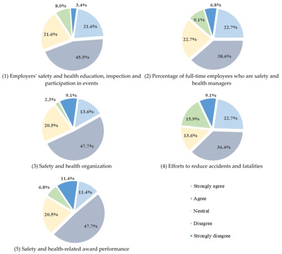 Figure 12 shows the results of the survey on the improvement model by item. Regarding the common item, 67.1% of the respondents expressed a positive opinion regarding the improvement of employers’ safety and health education, inspection, and participation in events. The percentage of full-time employees appointed as safety and health managers is a model that reinforces the existing evaluation indicator (increasing the proportion of regular workers and removing the basic point), and 61.3% answered positively in the questionnaire. A total of 61.3% responded with positive opinions regarding the item on “safety and health organization”, which was proposed to enable evaluation at the enterprise level by applying the improved classification system. As regards opinions on the item on “efforts to reduce accidents and fatalities”, which was newly formed, 59.1% answered positively. In the questionnaire on additional points, 59.1% answered positively to the newly proposed “safety and health-related awards” performance.
