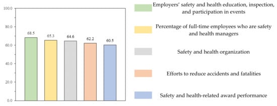 - Among the most common items, “Employers’ safety and health education, inspection, and participation in events” was used to encourage actual improvement measures after online/offline parallel education of the employer and employers’ on-site safety and health check. “Percentage of full-time employees who are safety and health managers” increased the rate of hiring regular workers and removed the basic points to increase discrimination. In “safety and health organization”, the calculation formula was developed in consideration of the ranking of the integrated construction capability evaluation amount of construction companies and safety and health capability. To directly reduce fatal accidents in the construction industry, “efforts to reduce accidents and fatalities” is classified as a license held by a construction company, and an evaluation indicator is presented;