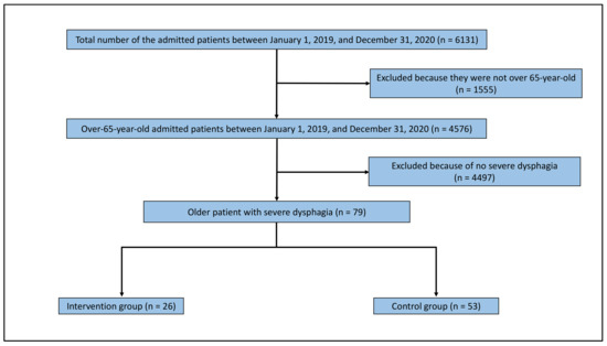 We performed a quasi-experimental study; all patients were aged > 65 years, with severe dysphagia, and had been admitted to the Unnan City Hospital between 1 January 2019 and 31 December 2020. The nurses assessed all patients for their ability to swallow using a water swallowing test (WST) in order to screen for dysphagia [21]. After obtaining positive WST results, the patients were assessed using a videoendoscopic test (VE) by an otorhinolaryngologist for the risk of dysphagia [22]. Upon observation of a delay in swallowing or a swallowing dysfunction with no confirmed aspiration, the patients were diagnosed with dysphagia and rehabilitated by speech therapists. If aspiration was confirmed, they underwent a video fluoroscopic examination (VF) for the appropriate suggestion of food [23]. Dysphagia was defined based on the diagnosis of an otorhinolaryngologist. The criteria for severe dysphagia were as follows: (i) <3 points of WST in any reclining position at bedside or (ii) the presence of aspiration or food entry into the larynx in VE or VF [21]. TFLP began in June 2019 in patients with severe dysphagia as confirmed by the WST, following an agreement by the patient or their family. Starting in April 2020, TFLP was performed in patients with severe dysphagia as confirmed by WST, VE, or VF. A speech therapist and a nurse specializing in dysphagia nursing, who had been trained in TFLP in May 2019, performed the intervention. They were charged with the assessment of the swallowing function, for 2 days every week. The intervention group was defined as the patients with severe dysphagia who were trained to feed in the TFLP. The control group was defined as the patients aside from those in the intervention group.