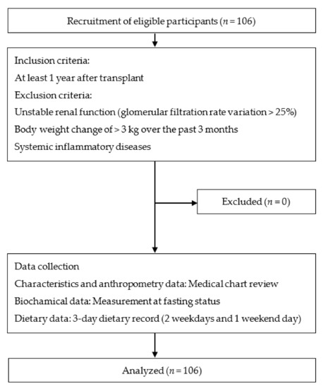 A registered dietitian at the participating hospital interviewed the participants in person. Data such as anthropometry, laboratory, and dietary intake were also collected according to standardized methods. Informed consent was obtained from each RTR before the interview. The study protocol was approved by the Chang Gung Medical Foundation’s Institutional Review Board (No. 201600954B0).