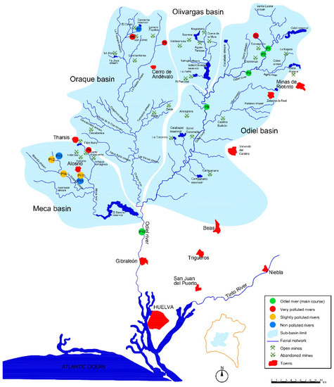 - Nieto, J.M.; Sarmiento, A.M.; Olías, M.; Cánovas, C.; Riba, I.; Kalman, J.; Delvalls, T.A. Acid mine drainage pollution in the Tinto and Odiel rivers (Iberian Pyrite Belt, SW Spain) and bioavailability of the transported metals to the Huelva estuary. Environ. Int. 2007, 33, 445–455. [Google Scholar] [CrossRef] [PubMed]