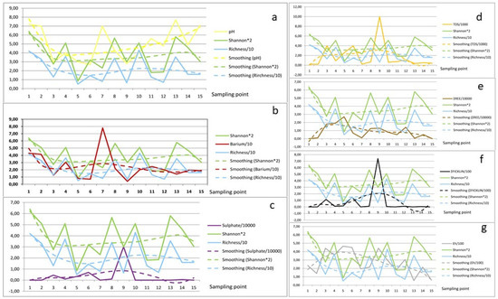Spatial evolution of physico-chemical parameters: pH (a), barium (b), sulphate (c), TDS (d), ∑REE (e), ∑Ficklin (f) and Eh (g) vs. Shannon–Wiener index and richness.