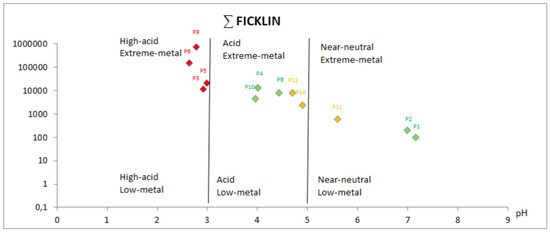 The Ficklin diagram (Figure 4) shows that in the most AMD contaminated points (3, 5, 6 and 9 in red), the metal concentrations are very high and the waters are extremely acidic, while the points with lower AMD contamination (11, 12 and 14 in orange) have a mean concentration of ∑Ficklin and a pH close to 5.