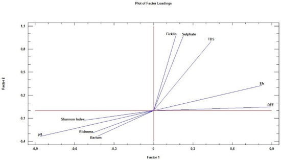 A first approximation to the model comes from the observation of a close proximity of Shannon, richness, barium and pH, all of them in the lower left quadrant; therefore, these have a negative correlation with Factors 1 and 2. In the opposite quadrant are the rest of the variables, clearly grouped in two groups. While ∑Ficklin and sulphate support a very high and positive correlation with Factor 2 and a slight correlation with Factor 1, ∑REE and Eh are highly and positively affected by Factor 1, and with a more discrete correlation with Factor 2. The TDS is in the middle, with high and positive correlation to both. The strict linearity between Eh and pH with a very high correlation coefficient already reported by several authors [73,76] should be highlighted. Therefore, in Figure 5 the two factors rotated by the varimax rotation method [77] suggest: