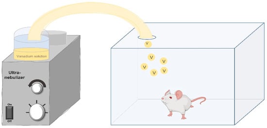 In 1999, the inhalation model in mice was described for the first time, using lead acetate [45], and in 2004, the first results with the model were published, this time using vanadium [46]. In this experimental murine inhalation model, mainly male CD1 mice are used; however, CD1 females and Wistar rats have also been studied. The experimental animals are placed in an acrylic box connected to the ultranebulizer for 1 h, twice a week, for 1, 2, 4, 6, 8 or 12 weeks, according to the selected experimental protocol. The methodological details of each protocol are accessible in the corresponding publications from which the more relevant findings are summarized below. The advantage of the ultranebulizer (connected to an acrylic case) in this model is that it generates particles of 0.5–5 micrometers in diameter from a solution of 0.02 M of vanadium pentoxide, reaching a concentration inside the box of 2.57 or 1.56 mg/m3 if the solution is at 0.01 M, as represented in Figure 1.