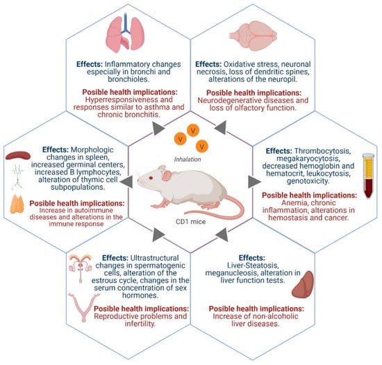 Some effects caused by vanadium inhalation in a mice experimental model and its possible health implications. Figure created with biorender.com.