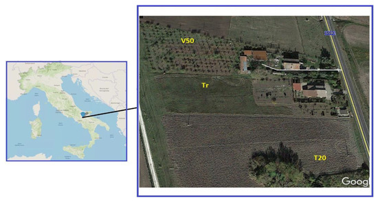 Hence, in the present study we report and compare data on the composition of a homogeneous soil from three adjacent sites within a radius of 100 m. These include a 50-year-old and still productive vineyard (indicated as V50, Figure 1); an adjacent field planted with cereals and forage since centuries (Tr); and a former vineyard (T20) adjacent to site 2, in production in the 1950–2000 period, now planted with rotating cereals and forage crops. V. Roviello, whose family inherited in part these plots, is aware of the reported information on the above-mentioned sites. In addition to the already mentioned soil analyses, we have extended our study also to grapevine branches and wines obtained from the site 1 (Figure 1).
