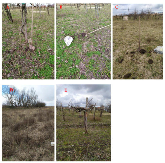 Sampling at the foot of the grapevines in V50 (A); in the middle of the grapevines in V50 (B); in a grapevine-free control area (Tr), (C); in ST20 (D). A 50-year-old grapevine specimen (E).