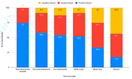 Figure 2. Non-voice sounds rated by respondents as having the most positive impact were recorded womb sounds and recorded instrumental music. The non-voice sound rated as having the most negative impact on auditory development was silence, see