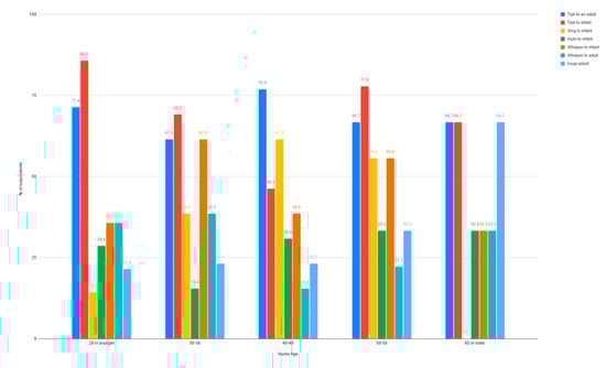 n = 6, 46.2%) indicated they used their voice to talk to an infant, while more than half of respondents from all other age groups reported using their voices to talk to an infant. Those 40–49 years old did, however, indicate they sang to infants when providing bedside care at a higher percentage (