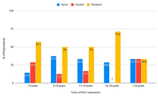 The impact of years of experience in the NICU was also used to explore nurse beliefs about the auditory environment. Across all levels of experience, the majority of nurses reported believing the NICU environment is not sufficient to meet the auditory needs of premature infants, see