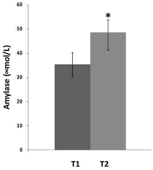 Salivary amylase levels before and after VLCKD in obese subjects. The Asterisk Indicates a Significant Difference (p < 0.05) compared to basal levels.