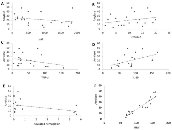 Salivary amylase correlated negatively with VAT, TNF-a and glycated hemoglobin (panels A,C,E) and positively correlated with Orexin-A,IL-10 and HRV (panels B,D,F).