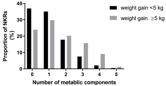 The weight gain group had a higher proportion of subjects with three or more metabolic components than the non-weight gain group (26% vs. 10%, p < 0.001) (Figure 1). The non-weight gain group had a higher proportion of subjects with no or one metabolic component than the weight gain group (72% vs. 54%, p < 0.001).