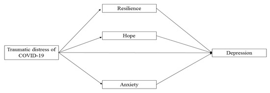Representation of the hypothesized mediation model. Traumatic distress of COVID-19 is expected to influence depression levels, while resilience, hope and anxiety are expected to mediate this influence.