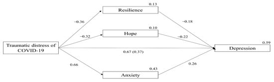 The COVID-19 traumatic distress had a total strong significant effect on depression prior to considering any mediating effects by positively predicting depression scores (β = 0.67, SE = 0.03, p = 0.001, CI = 0.61 to 0.72). The bootstrapped mediation analysis showed that when all mediators were considered in the model, the effect of the traumatic distress of COVID-19 was reduced but still exerted a significant positive effect on depression (β = 0.37, SE = 0.05, p < 0.001, CI = 0.27 to 0.47). Further inspection of the indirect effect revealed that this was significant (β = 0.30, SE = 0.04, p < 0.001, CI = 0.22 to 0.38), indicating that when considered jointly, resilience, hope and anxiety mediated the effect of the COVID-19 traumatic distress on depression. Because this effect remained significant after considering the mediators, a partial mediation was present.
