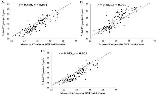 In the present study, there was no significant difference between the measured VO2max by GXT and estimated VO2max in case 1; however, there was a significant difference between VO2max by GXT and the estimated VO2max by cases 2 and 3 (Table 5). The mean bias between the measured VO2max and the estimated VO2max in cases 1, 2, and 3 were −0.54 mL/kg/min, −1.32 mL/kg/min, and −0.93 mL/kg/min, respectively (Table 5). The measured and estimated VO2max in all cases showed a similar average value, and their correlation coefficients also demonstrated a significant correlation (measured VO2max and estimated VO2max in case 1: r = 0.890, p < 0.001; measured VO2max and estimated VO2max in case 2: r = 0.883, p < 0.001; measured VO2max and estimated VO2max in case 3: r = 0.903, p < 0.001) (Figure 3).