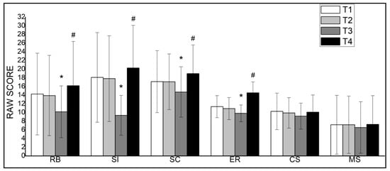 Gilliam Autism Rating Scale-Third Edition (GARS-3) subscales for repetitive behaviours (RB), social interaction (SI), social communication (SC), emotional responses (ER), cognitive style (CS), and maladaptive speech (MS) at baseline (T1-Baseline), after the 8-week control period (T2-Control), after the 8-week judo training intervention (T3-Judo), and after the 8-week COVID-19 lockdown period (T4-Lockdown). * significantly different (p < 0.05) from T1-Baseline, T2-Control, and T4-Lockdown. # significantly different (p < 0.05) from T1-Baseline, T2-Control, and T3-Judo.