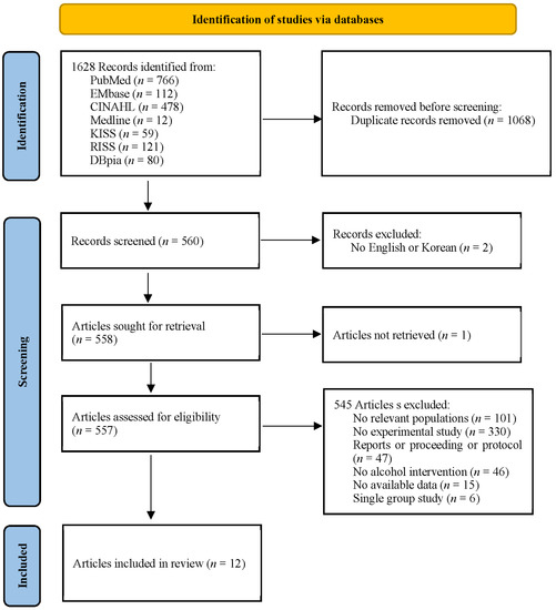 The total number of studies returned from each database using the search strategy was as follows. There were 766 papers obtained from PubMed, 112 papers from EMBASE excluding PubMed from the Cochrane Library, 478 papers from CINAHL, 12 papers from Medline, 59 papers from KISS, 121 papers from RISS, and 80 papers from DBpia—a total of 1628 papers. After removing duplicated papers and papers that did not meet the inclusion criteria, a total of 12 papers were selected. There were three experimental groups analyzed in each study of Koning et al. [25] and Komro et al. [26], and two experimental groups in the study of Mckay et al. [27]. Therefore, in this review, each intervention performed in the experimental groups was separately divided into a–c and a, b for inclusion in this study (Figure 1).
