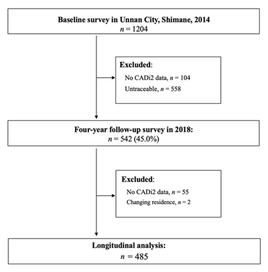 The research team collected longitudinal data between August and October in 2014 and in 2018, in collaboration with the annual health examination program that involved the population of Unnan City, Shimane Prefecture, Japan. Annual health examinations are available once a year for residents in this municipality who are covered by the National Health Insurance. We provided information regarding this study at least once to potential participants through a document prior to conducting the health examinations. The participants were older adults aged 60 years and above who were residing in Unnan City, which has an aging population of more than 35%. The study included those who had participated in both the baseline survey in 2014 and the follow-up survey in 2018. After excluding those with missing data (n = 55) and those who did not reside at the same address as in 2014 (n = 2), the total sample size was 485 (218 males and 267 females) (Figure 1).