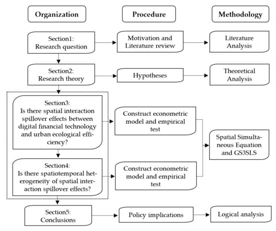 In Section 1, through reviewing existing relevant literature, the core issue of the research is proposed: what is the relationship between digital financial technology and urban ecological efficiency? In Section 2, based on the analysis of the relationship between key variables, this paper puts forward the research hypotheses and introduces the empirical model, data sources, and pre-processing. Section 3 analyzes the spatial interaction spillover effect between digital financial technology and urban ecological efficiency and tests its robustness. Section 4 is an additional analysis, which considers the heterogeneity of spatial interaction spillover effects based on regional differences and time differences. Section 5 draws the basic conclusions.