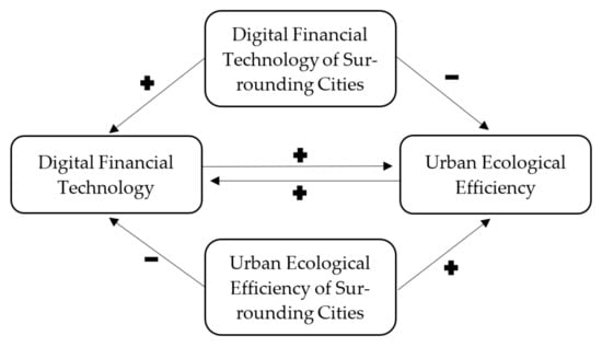 The spatial interaction mechanism of digital financial technology and urban ecological efficiency is complex. First, as an essential driver of regional innovation and development, the agglomeration of digital financial technology to the surrounding cities weakens the local development momentum. Interregional digital financial technology competition exerts downward pressure on local ecological efficiency. Areas with lagging financial development need to actively undertake resource transfer, strengthen the endogenous support mechanism of local financial development for urban ecological efficiency, and improve the systematic driving force of local urban ecological efficiency. Second, the optimization of the industrial development environment and the innovative development of the ecosystem driven by the improvement of ecological efficiency of surrounding cities can siphon local financial resources. At the same time, surrounding cities with high ecological efficiency often have more sound and more substantial financial support policies, forming a powerful attraction to the local digital financial technology enterprises and talents. Based on the above analysis, the following hypothesis is proposed: