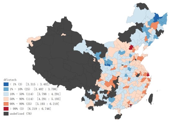 The development of digital financial technology has spatial characteristics. Knight and Wójcik describe financial technology as a controversial, mature and geographical research field. By the end of June 2020, 10 financial technology papers (classified by the Web of Science) had been published in the field of geographic research []. Clark and O’Connor oppose the assertion of “the end of geography” and use information-related factors to validate the complex division of financial labor at different spatial scales []. Shen et al. construct a comprehensive index of digital financial inclusion, and the spatial distribution of the index presents a strong regional aggregation and the aggregation pattern of national income groups []. To obtain the economic intensity of agglomeration similar to that of the world’s top cities in the financial field, Shanghai’s spatial structure needs to be more concentrated, and its economic density needs to be more complex []. Rodima and Grimes analyze the latest developments of international remittances in developing countries from the perspective of infrastructure, which reveals essential junction points between diverse money transfer pathways and institutions, depicting their spatial configuration and relationality as well as their potential to affect power differentials, and allowing for a socially embedded view of digital disruption [].