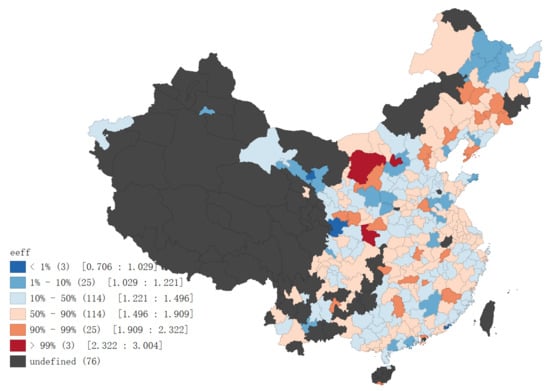 Based on the above DEA distance function and panel data model, this paper selects the social fixed asset investment, employees, built-up area and energy consumption of the sample cities as the input indicators. Take GDP as the expected output and represent the total output value; waste water, waste gas and smoke emissions are regarded as unexpected outputs, representing pollution emissions. The specific input–output indicators are shown in Table 3. Figure 4 reports the average distribution of ecological efficiency levels of sample cities during the investigation period (the figure only shows sample cities of this research, excluding sea areas, etc.).