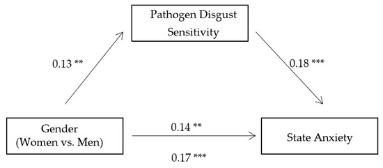 The mediating role of pathogen disgust sensitivity between gender and state anxiety. Note: Significance of the standardized regression coefficients is indicated (** p < 0.01 and *** p < 0.001).