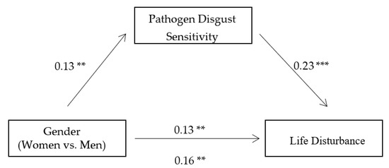 The mediating role of pathogen disgust sensitivity between gender and life disturbance. Note: Significance of standardized regression coefficients is indicated (** p < 0.01 and *** p < 0.001).