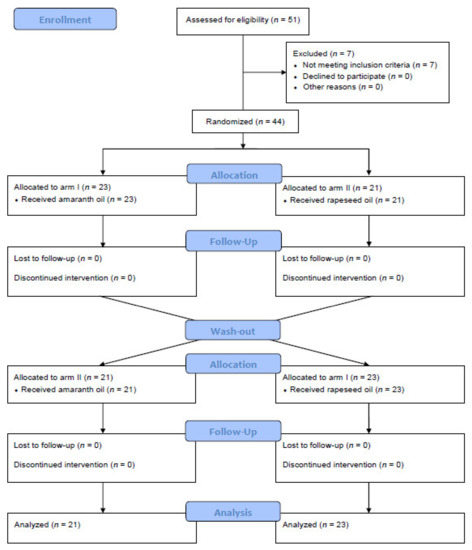 The study intervention has been described in detail previously [19]. Briefly, all participants were randomly assigned (allocation ratio: 1:1) to arms I and II. In arm I, amaranth oil was administered in a dose of 20 mL per day in the first intervention, and rapeseed oil in a dose of 20 mL per day was provided in the second intervention. All subjects received the same dose of oils. In arm II, subjects received rapeseed oil in the first intervention and amaranth oil in the second intervention. The dose of both oils in arm II was the same as in arm I. The duration of both interventions was three weeks and they were separated by a three-week washout period. The amaranth oil used in the study was extracted from Amaranthus cruentus L. and produced by the Szarłat company (Łomża, Poland). The rapeseed oil was extracted from Brassica napus L. and was supplied by the Vitacorn company (Poznań, Poland). Both oils were cold-pressed and stored in identical dark bottles. According to the manufacturer’s instructions, both oils were kept in refrigerated storage. During the intervention, participants were instructed to not change their dietary habits and physical activity. Importantly, the doses of applied oils were exchanged for the same amount of fat used in the diet. Therefore, the energy contents of the diet did not change during the intervention. Moreover, during the intervention, subjects were supervised over telephone by the nutritionist to check compliance with the study protocol, especially regular administration of the appropriate oil. To verify adherence to the study protocol, participants were instructed to regularly return empty oil bottles to the research team. No deviation from the study protocol was noted.