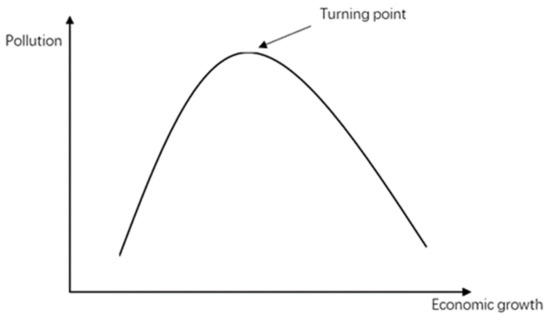 According to the EKC hypothesis, there is an inverted U-shaped relationship between economic growth and environmental pollution, that is, environmental quality has a dynamic trend of deterioration first and then improvement with economic growth [10,11]. The EKC hypothesis comes from the observation of economic data. Grossman and Krueger [11] found no evidence that environmental quality deteriorates steadily with economic growth. Rather, for most indicators, economic growth brings an initial phase of deterioration followed by a subsequent phase of improvement. The EKC is exhibited in Figure 1.