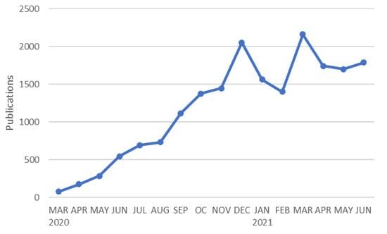 The data were collected from Scopus by 30 July 2021, and all available publications were considered, up to 18,955 manuscripts. Since the outbreak of SARS-CoV-2 virus occurred at the beginning of the previous year, the results covered the year 2020 and the first six months of 2021.