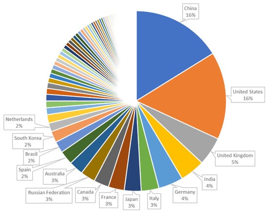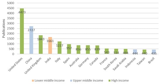 It should be noted that the two countries with the highest scientific production also correspond to the two largest economies in the world, based on their GDP (USD 21,433,226,000,000$ and USD 14,342,903,006,431$, respectively, for the USA and China [52]). The 10 countries with the highest numbers of publications are all classified as high-income nations by the World Bank [53] with the exceptions of China and India, which are in the upper middle and lower middle income bands, respectively (Figure 3). In this ranking based on numbers of papers, the highest country that is classified as low income is Ethiopia, in 60th place, having published only 10 papers.