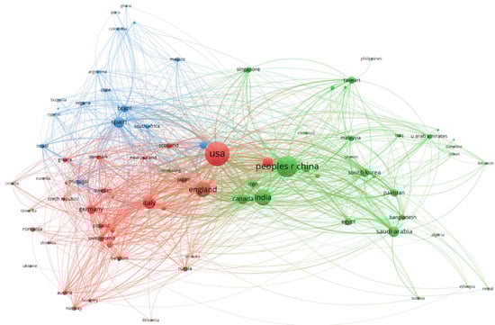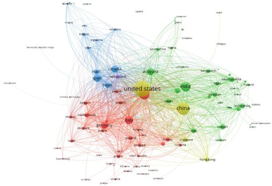 After examining the amounts of scientific production, we investigated the main collaborations among countries (Figure 5; please note that the colors of the clusters are not related to the colors used in the previous figures).