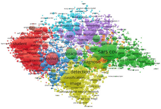 The six clusters can be described as follows. Two main groups can be distinguished: the first three clusters (red, light blue, dark blue) represent topics related to AI applications and data analysis at large scales and at the social level, such as spread monitoring, the localization of outbreaks, social adaptations to remote work, public policies and psychosocial consequences of the pandemic. In this first group, the boundaries were sometimes blurred, as certain intelligent data analysis applications can be understood as being on the borderline between one category and another.