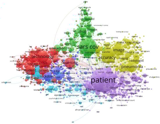 A topic analysis was carried out with VOSviewer [54] to build a map representing the main relevant subjects and their relationships, using semantic analysis. In our case, the text mining algorithms identified 4485 relevant subjects using Scopus, and the clustering process classified these into six main clusters according to their similarities (Figure 7). Clusters were created based on the frequency of co-occurring terms: the more often the words tend to co-occur they get painted into clusters. The size of each circle represents the number of times that a word occurs. This automatic procedure was supported by the expertise of the authors in this field, which made it possible to identify the issues and gain a better understanding of the concept maps. As the present paper aims to provide an overview of almost 19,000 papers (Scopus), the following points are not intended to be an exhaustive review of all of the possible contributions, but rather to provide clarifying examples of the topics represented by each of the clusters.