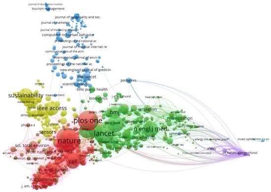 This type of analysis makes it possible to superimpose other types of information, such as the year of publication, on either of the two previous analyses described above, meaning that the trajectory of a given line of research or collaborations can be seen. This strategy is one of the most important tools that can be used in scientometrics [35] for automatic trend detection. Using this approach, it is possible to see at a glance the evolution of a subject. VOSviewer can be used to plot a map showing the relationships between certain elements and then to overlay other data points with added information (e.g., citation impact, age of publication, etc.).