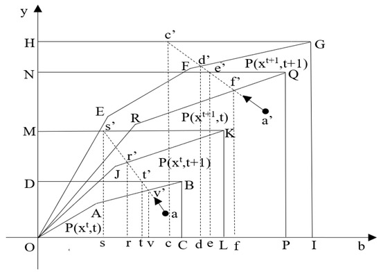 where and represent the inputs at period t and t + 1 respectively. In Equation (7), is the maximum unregulated good output with both the inputs and technology in period t + 1. Similarly, is the maximum unregulated good output with both the inputs and technology in period t. By contrast, is the maximum unregulated good output with the inputs in period t + 1 while the technology in period t, and is the maximum unregulated good output with the inputs in period t while the technology in period t + 1. Likewise, we can obtain the corresponding maximum regulated good output by substituting the subscript u by r.