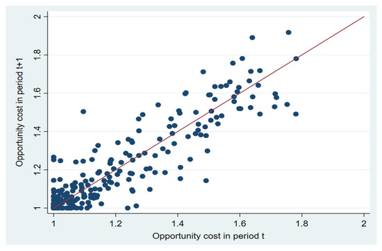 Change in opportunity cost by province over time. Note: The points in the figure represent the regional OC. The horizontal line represents the OC of the region in period t, and the vertical line represents the OC in period t + 1. The 45-degree line shows that regional OC does not change in two consecutive years. If the point is above the line, this means the OC increase from period t to t + 1; if the point is below the line, this means the OC decrease from t to t + 1.