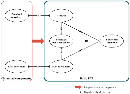 The basic TPB model comprises only three principal psychological constructs that are inadequate to cover other contributory factors such as the perceived risk and knowledge. Nevertheless, the basic TPB model provides an adaptable framework for various research backgrounds. Ajzen also claimed that the basic TPB is a user-friendly model allowing further expansion of the model to meet a variety of research needs [31]. Therefore, we incorporated two additional moderators in the model-risk perception and perceived knowledge, which have been already tested in other studies in the literature [57,75,76].